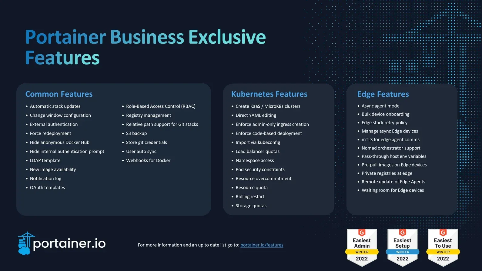 - Small and Medium-sized Businesses (SMBs): For SMBs, Portainer is an excellent choice for managing containerized applications without the complexities of managing Kubernetes clusters directly. However, Portainer's Business Edition extends its capabilities by allowing you to provision Kubernetes clusters locally or on a wide range of cloud providers, such as Amazon Web Services (AWS), Microsoft Azure, and Google Cloud Platform (GCP). This eliminates the need for SMBs to manually install and configure Kubernetes, making it easier to adopt containerized applications.