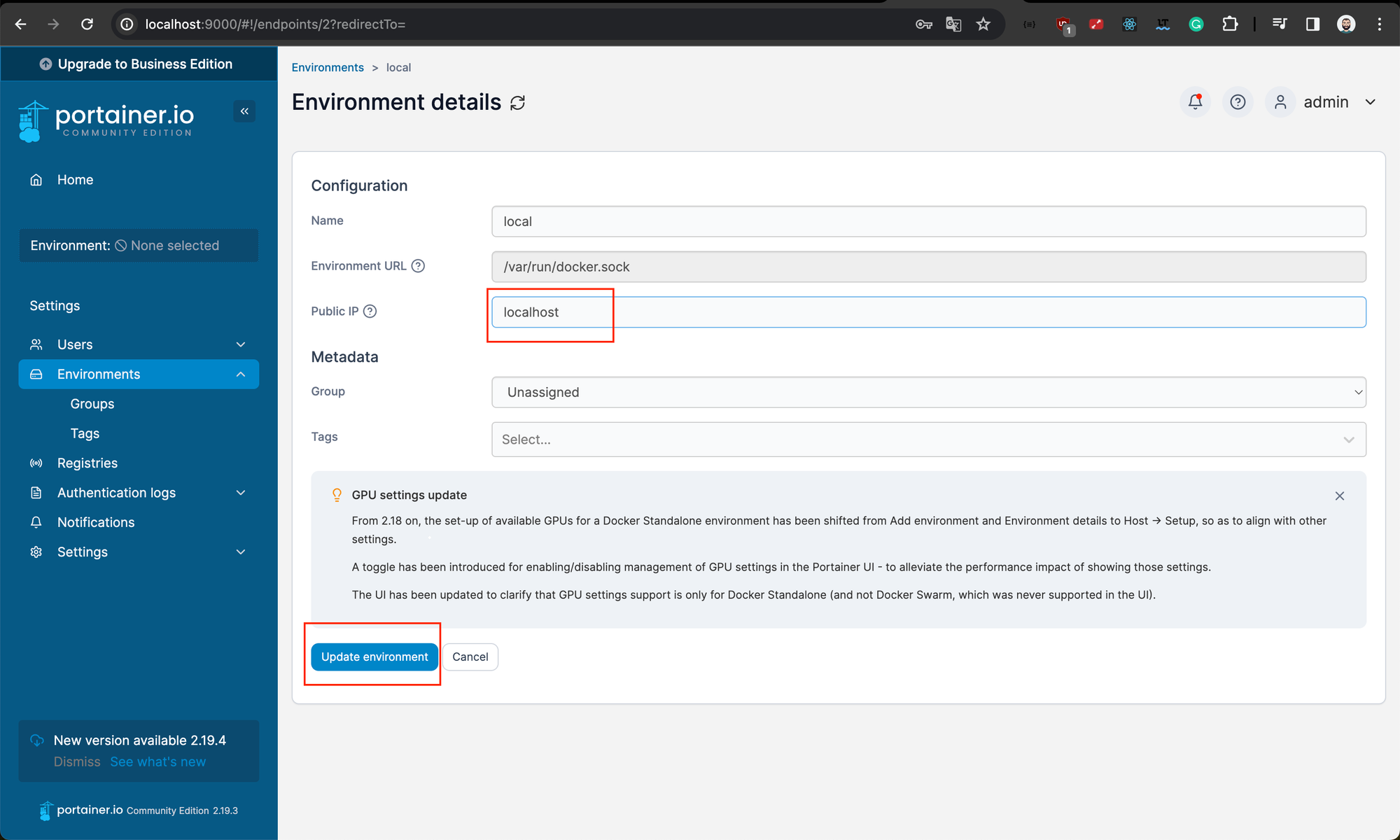 Set the Public IP (localhost or ip) via Settings > Environments > local (it will allow you clicking on an exposed port of a container and to get redirected):