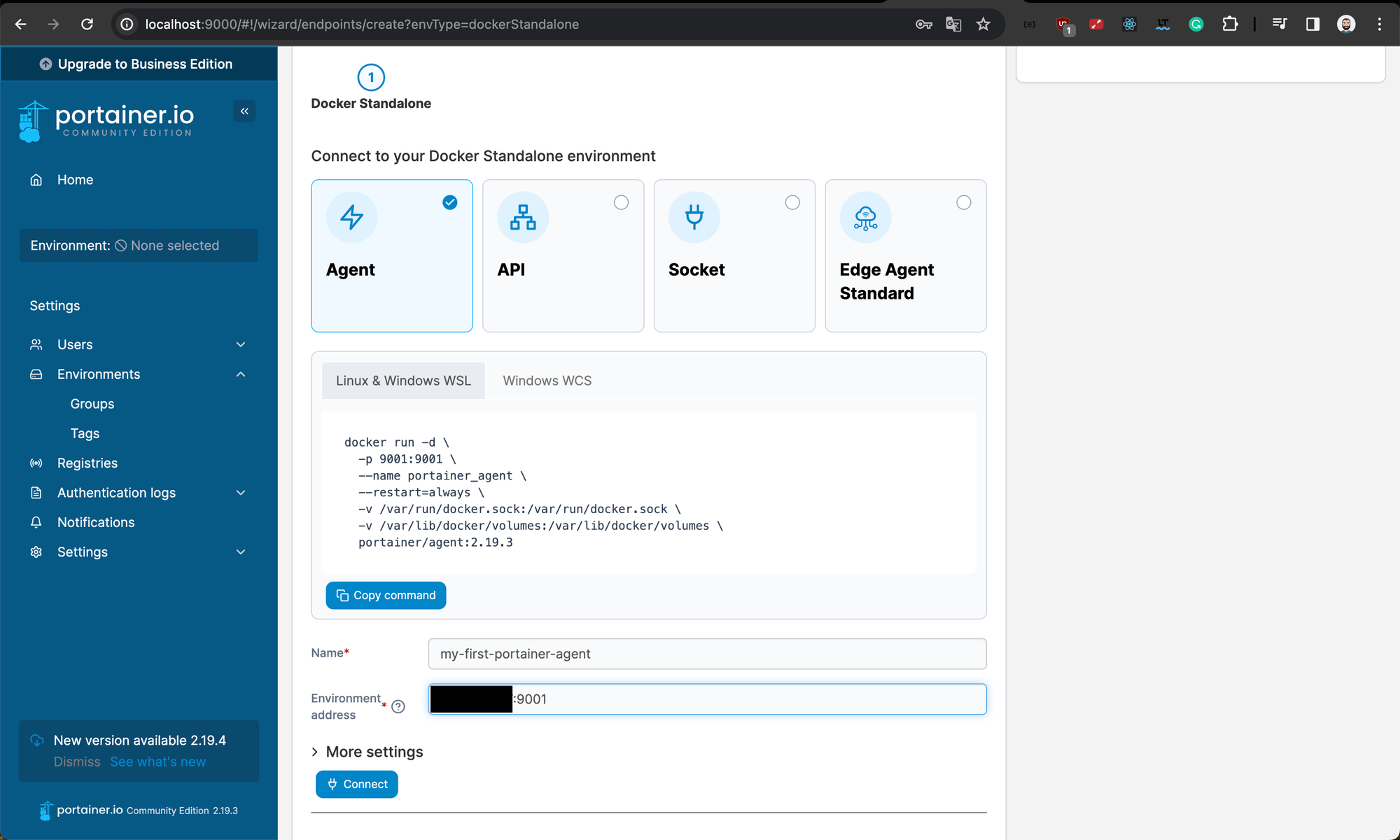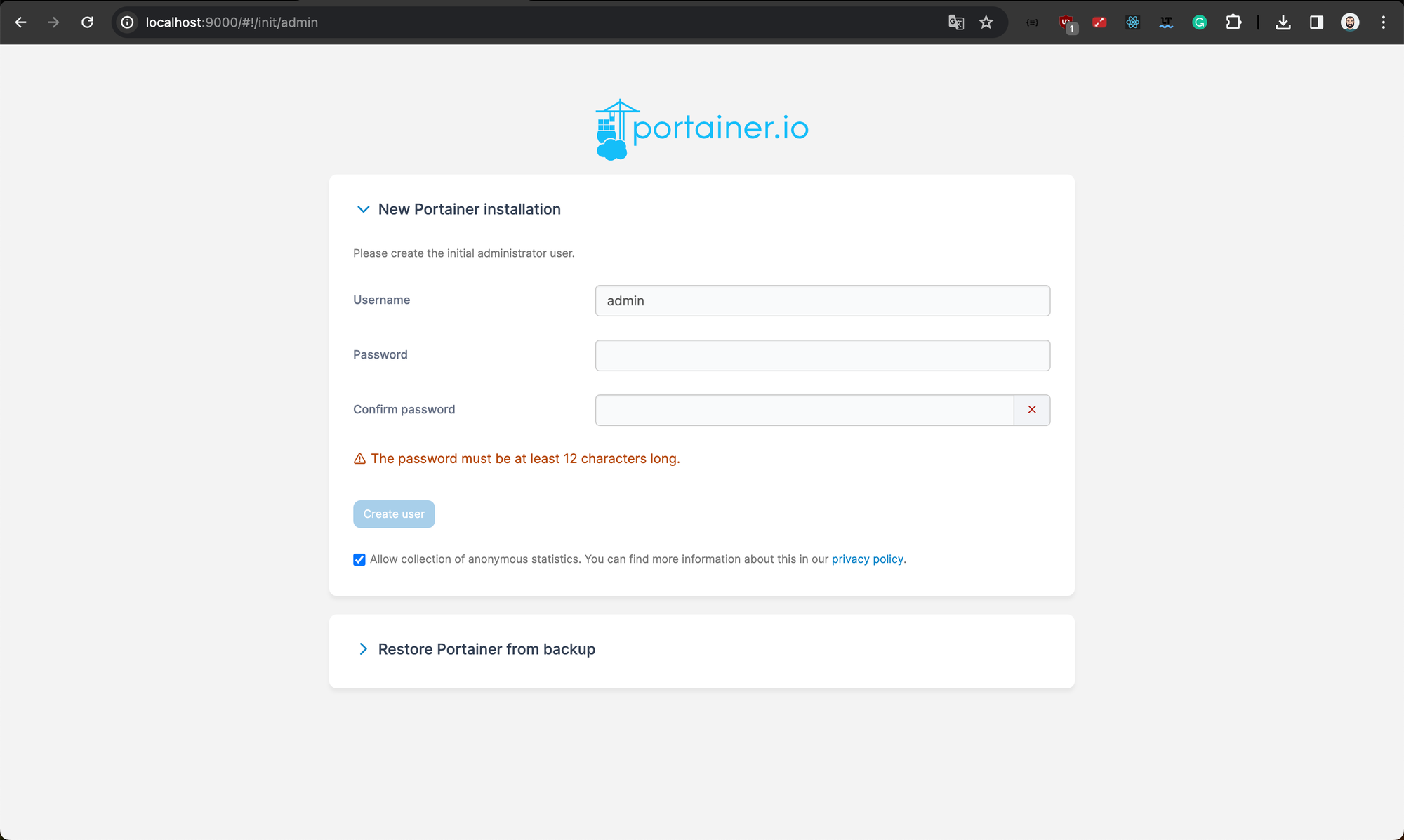 docker-compose up -dYou will now be able to browse and set up your admin user via: http://localhost:9000