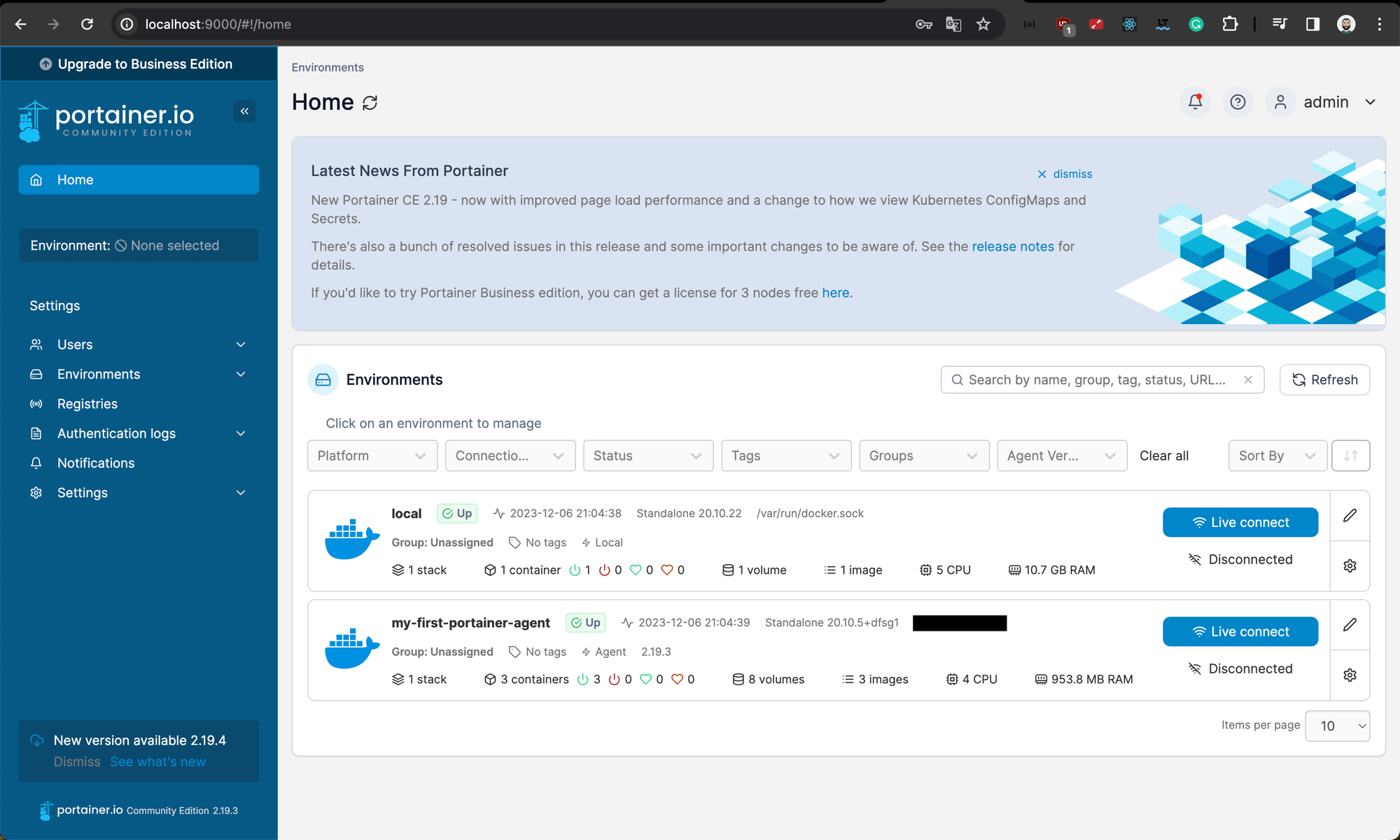 Once you are done, click HOME and you should see your two environment up on the Home page. Click on the environment of your choice to install ghost: