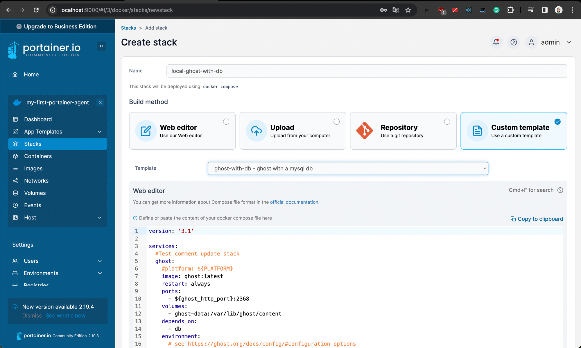 We will now deploy Ghost using custom templates and stacks. (For more detailed explanation, please check here)
